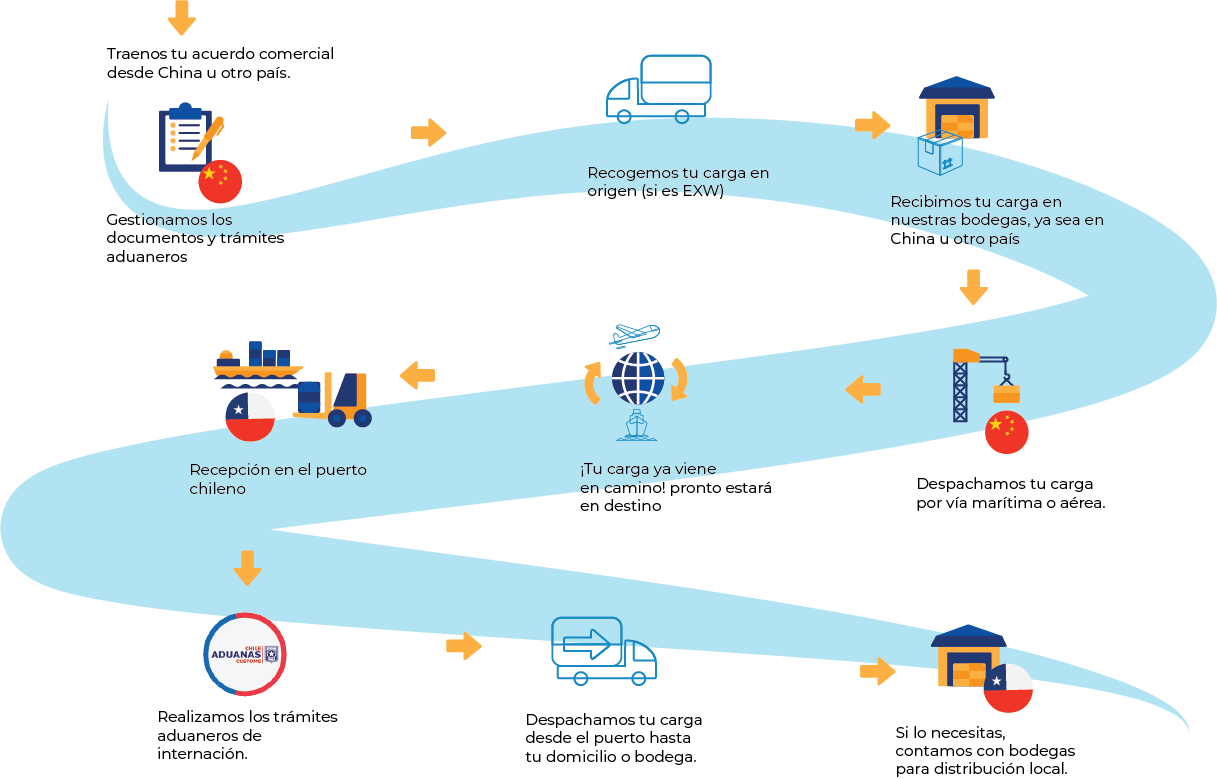 Somos un Proveedor Logístico 360°, lo que significa que reunimos todos los servicios en un solo lugar: contactamos a tu proveedor en China u otro país, coordinamos el transporte y te ayudamos con todos los trámites documentales ante la Aduana de Chile. Una vez que los productos llegan al país, también gestionamos la entrega directa a la puerta de tu casa o empresa.
